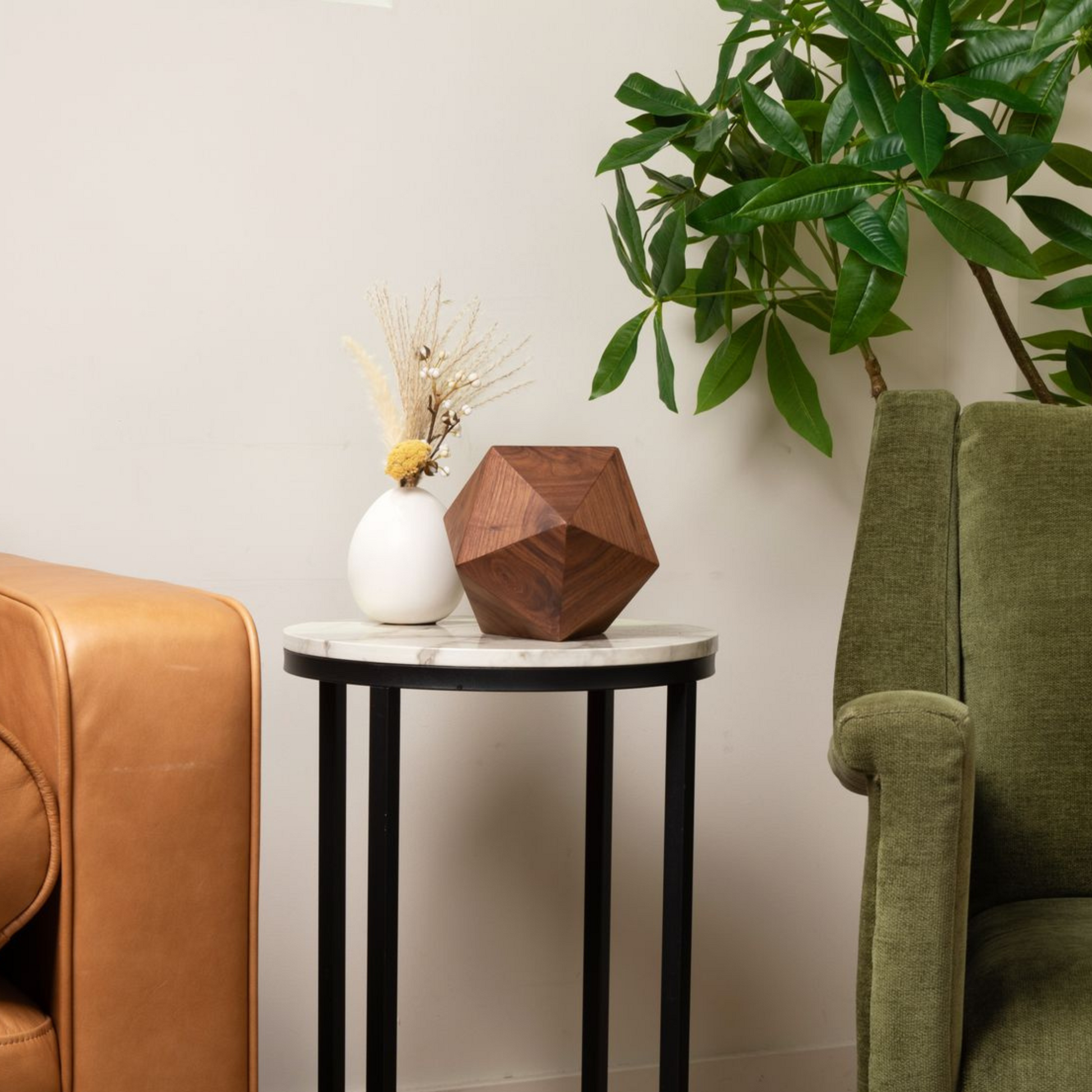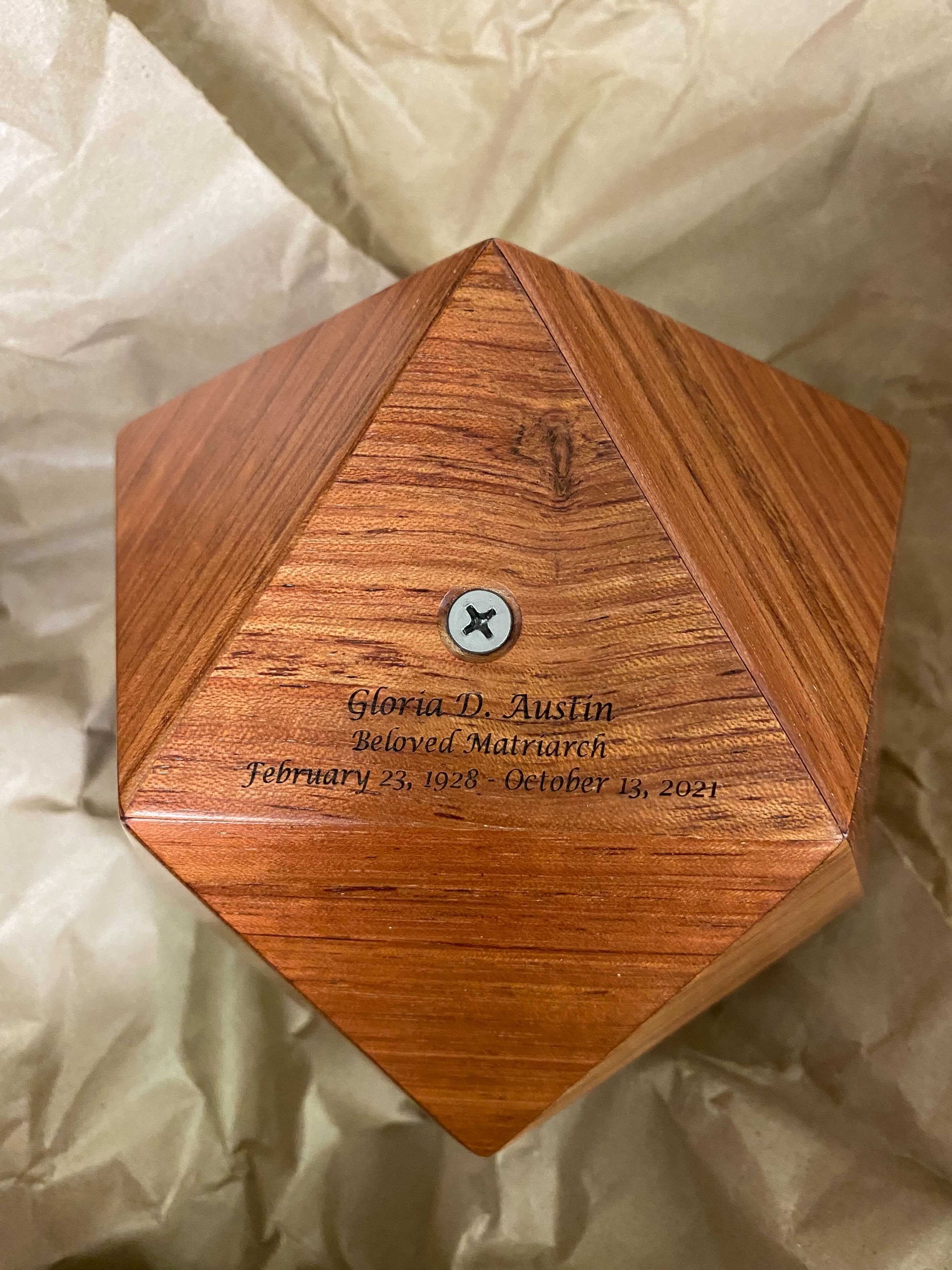 Handmade by master artisans, the Barnes urn in Walnut wood is a stunningly unique art piece to memorialize a loved one. The lid, designed to insert ashes, can be easily removed by unscrewing it from the top, which unlocks using our three-pronged latch mechanism (see photo).